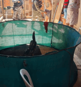 Equipes da Diretoria Especializada em Operações Policiais (Deop) foram até a residência para cumprir um mandado de busca e apreensão, e ao chegarem no local encontraram uma espécie de “arena” improvisada, diversos galos de raça, medicamentos, biqueiras e outros materiais utilizados na prática ilegal.