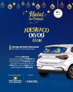 Para os cem primeiros condutores de veículos que passarem na loja da Solar Diamante- que fica localizada na BR – 428, Nº5, Bairro: Boa Esperança- colocarem o adesivo alusivo à campanha natalina, receberão dez litros de combustível e terão direito a 10 cupons que entrarão no sorteio final da premiação do Natal da Cidade, que contempla vários prêmios, inclusive um carro e uma moto zero quilômetro, além de R$5 mil, R$10 mil e R$ 15 mil em espécie.
