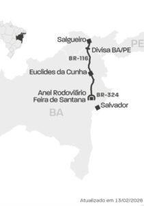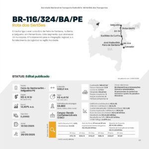 A nova concessão da chamada “Rota dos Sertões”, trecho da BR-116 e BR-324 que liga o anel rodoviário de Feira de Santana, na Bahia, até Salgueiro, em Pernambuco, já tem data marcada para ir a leilão. O edital foi publicado pelo Ministério dos Transportes e pela ANTT no último dia 13 de fevereiro, e o leilão acontecerá em 28 de maio de 2026, na B3, em São Paulo.