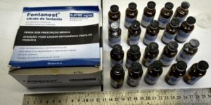 Com ela, foram encontrados 20 frascos de fentanil, além de pacotes contendo ácido bórico e garrafas de vidro com éter, insumos químicos utilizados no preparo de cocaína, e um celular.
