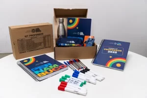 Cada kit é composto por itens que auxiliam no planejamento e na rotina de sala de aula, como agenda personalizada com espaço para o planejamento semanal, dois cadernos, um estojo, canetas esferográficas, marcadores para quadro branco (pilotos) e uma squeeze. O material foi idealizado a partir do diálogo com a rede e atende a uma demanda antiga da categoria por itens de uso prático e funcional.