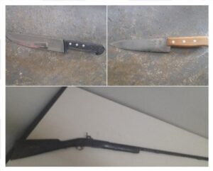 Além da arma, os policiais também encontraram em poder do suspeito um bornal contendo duas facas, além de: