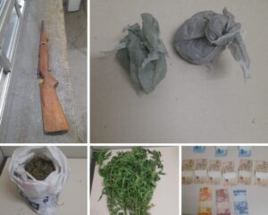 Ao chegarem ao local indicado, os policiais constataram a veracidade das informações. No quintal da casa foram encontradas aproximadamente 28 covas com um total de 140 pés de maconha. Durante a abordagem, o responsável pela residência confessou ainda possuir uma espingarda artesanal e cerca de 1.750 gramas de maconha pronta para o consumo, armazenadas em um saco branco.