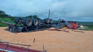 Carreta carregada de milho tomba na BR-424 em Garanhuns e deixa motorista ferido