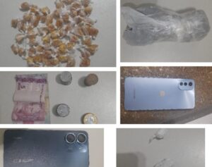 Ao chegarem no local indicado, a esposa do suspeito, permitiu a entrada da equipe. No momento, o imputado foi visto arremessando mais entorpecentes no quintal. Dentro da casa, os policiais encontraram ainda um prato com pó branco semelhante à cocaína e um cartão de crédito, além de pedras de crack sobre uma caixa de som. Em buscas no terreno baldio ao lado da casa, foi localizada uma sacola contendo mais pedras de crack, jogada momentos antes pelo suspeito, além de uma embalagem com substância análoga à maconha.